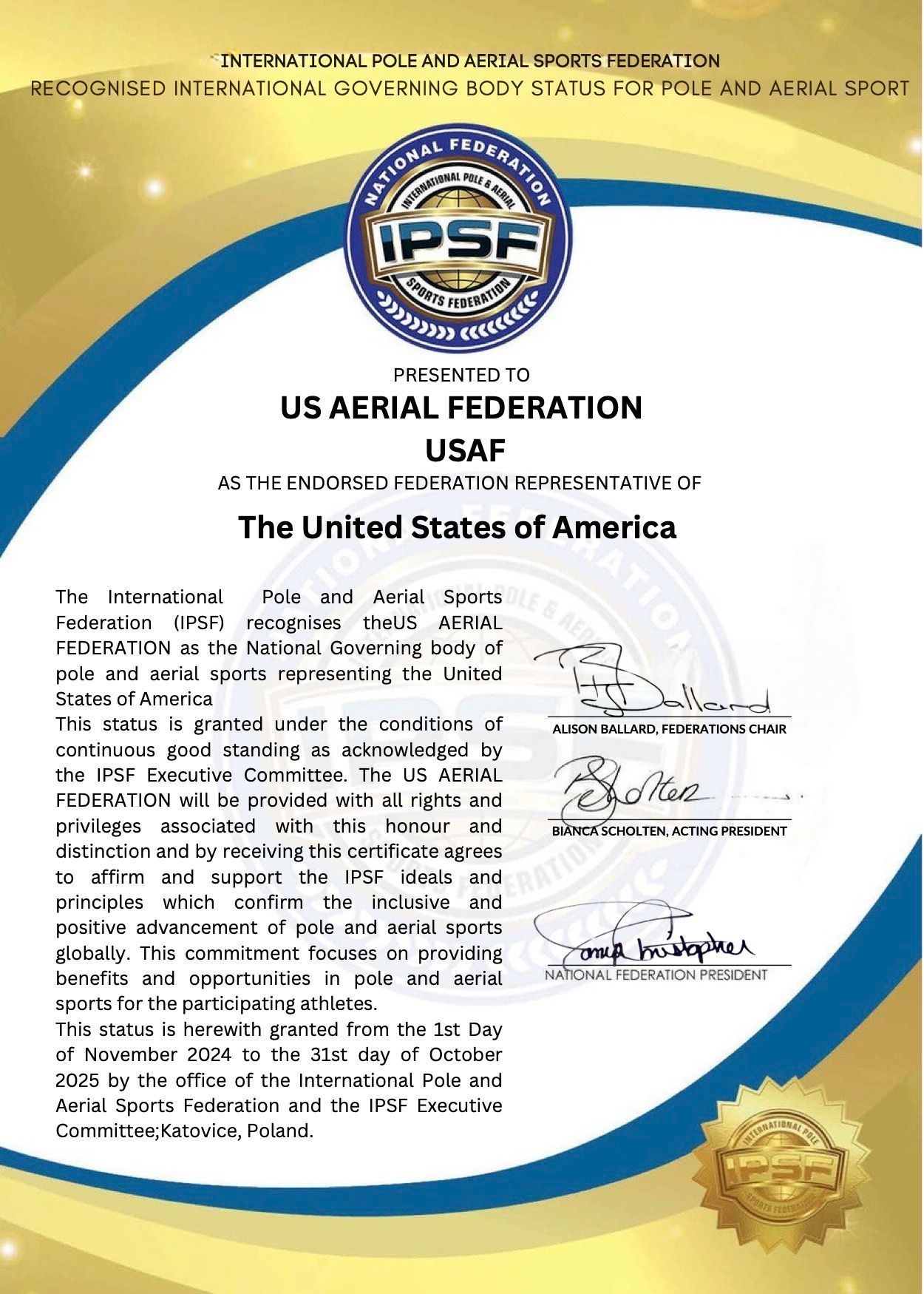 The US Aerial Federation is the official U.S.A. Pole and Aerial Sports Federation recognized by the International Pole Sports Federation (IPSF). Members are eligible to compete in the World Pole & Aerial Championships (WPAC) as well as National Competitions across the U.S.